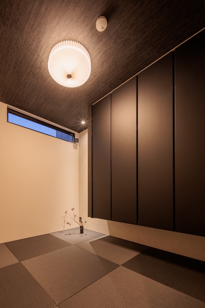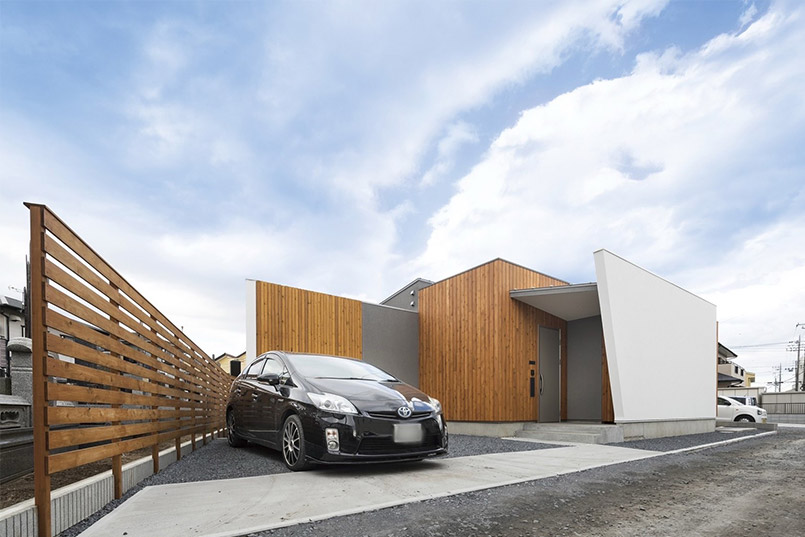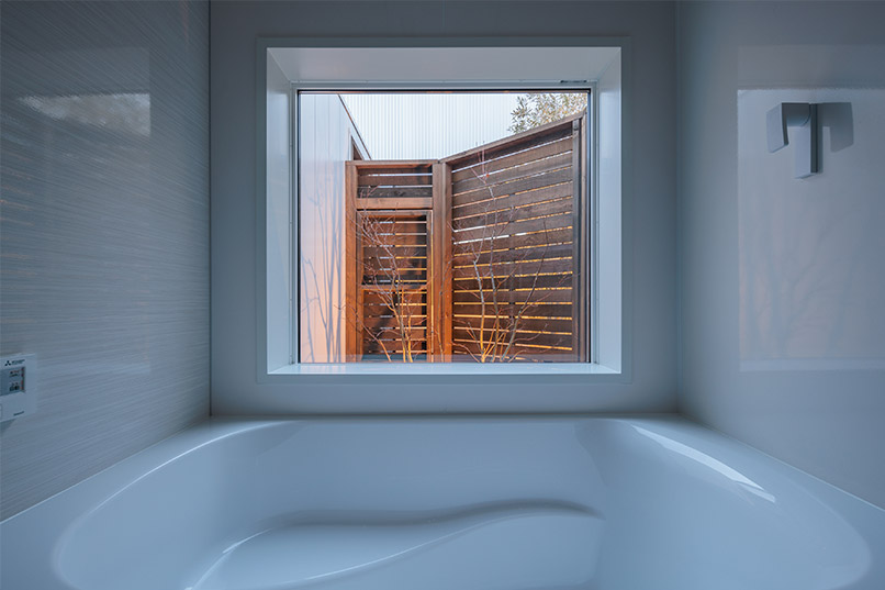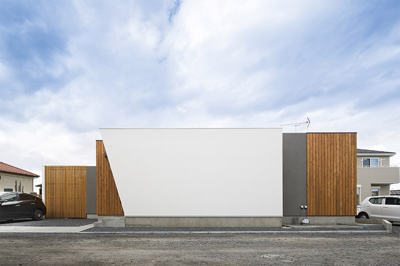 また、プライバシーを守るために格子の形状を菱形にするなど細部にもこだわりました。外観は周囲との調和を考えリシン吹付と木の組合せを採用し、斬新な形とは裏腹に落ち着いた飽きのこない和モダンテイストに仕上げました。漆喰の白い壁が上品で洗練された印象を与えます。また、断熱材にはセルロースファイバーを採用し、防音効果も高めています。